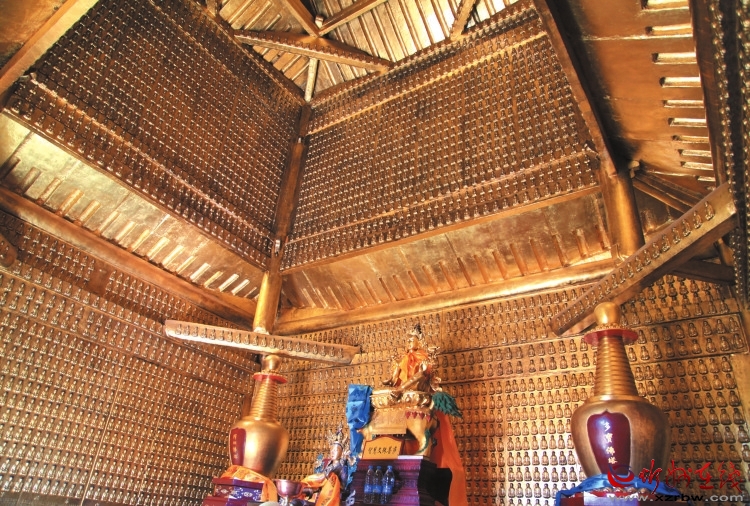 隔扇外壁鑄有36幅花卉圖案,有二龍戲珠、魚(yú)躍龍門(mén)、犀牛望月、玉兔拜月等,構(gòu)圖清晰,形象生動(dòng)。殿內(nèi)四壁滿鑄小佛,號(hào)稱萬(wàn)佛,佛像形態(tài)各異,栩栩如生。殿內(nèi)正中供奉著一尊高達(dá)1米的銅鑄文殊騎獅像,其鑄藝高超,神態(tài)逼真,體態(tài)閑適,是明代銅鑄佛像之珍品。
