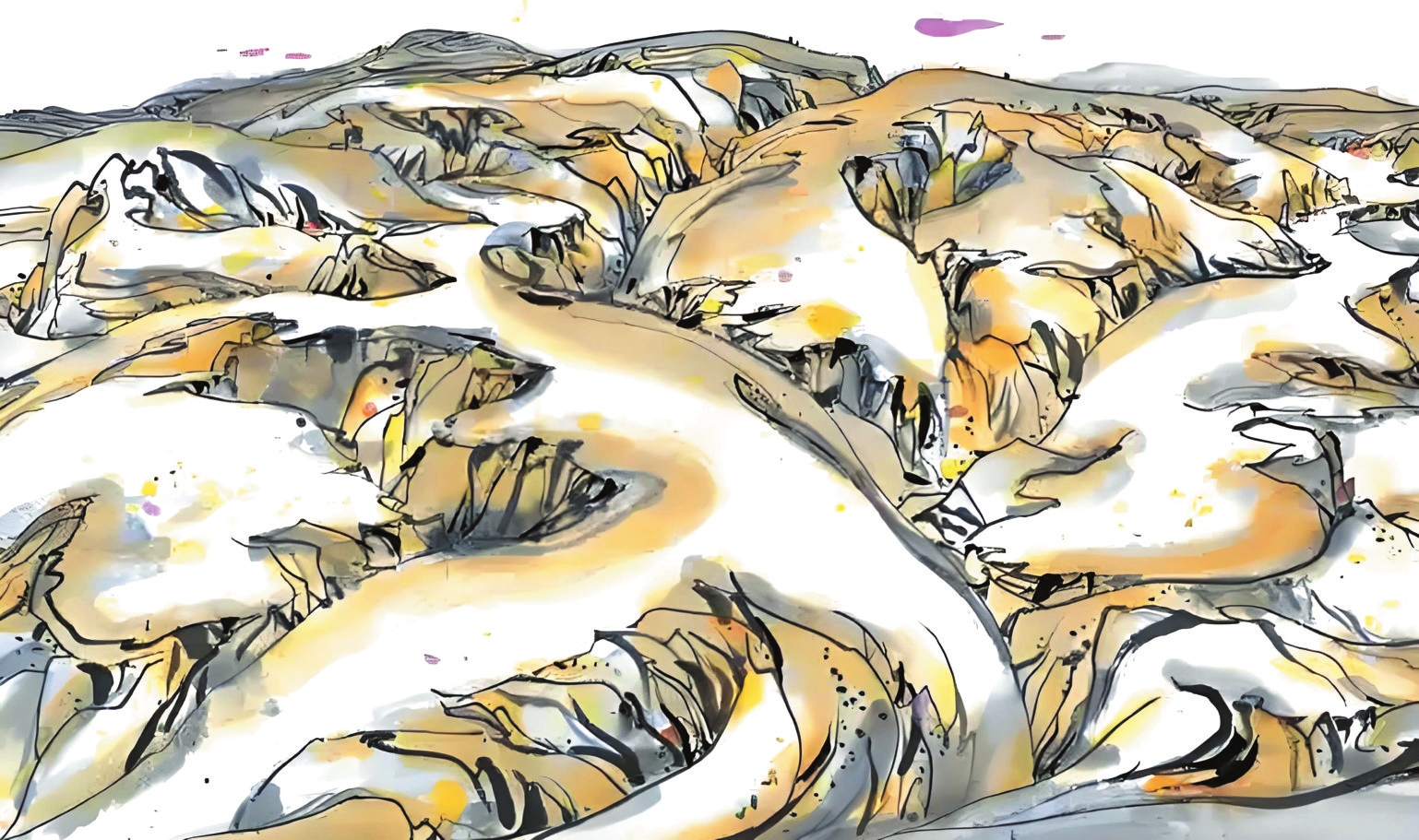 1989年10月的河曲寫生,是吳冠中藝術(shù)生涯的重要轉(zhuǎn)折點(diǎn)。在陪同的學(xué)生王秦生引導(dǎo)下,這位古稀老人尋找“黃土荒漠之典型地區(qū)”,最終駐足晉西北河曲縣。每日晨起,他面對(duì)被雨水沖刷、滿山皆溝壑的地貌,靜心思考,猛然產(chǎn)生了驚人的藝術(shù)聯(lián)想——起伏的山形如同眾多老虎,而那些溝壑恰似老虎皮毛上的斑紋。他在《出現(xiàn)老虎》一文中寫道:“我終于發(fā)現(xiàn)黃土高原是展拓了的老虎之群,其間伏臥著無數(shù)猛虎,有的正將躍起,有的還在酣睡。作完數(shù)幅黃土高原,意猶未盡,于是我畫起老虎來?!边@種將地理特征轉(zhuǎn)化為藝術(shù)創(chuàng)作標(biāo)志著吳冠中完成“從風(fēng)景寫生到精神寫意”的蛻變,其價(jià)值在于為現(xiàn)代中國(guó)畫開辟了根植本土、融貫中西的新路徑。一個(gè)月河曲翠峰山寫生之旅誕生的《老虎高原》,更以極富樂感的線條勾勒出這片土地精神的圖騰。