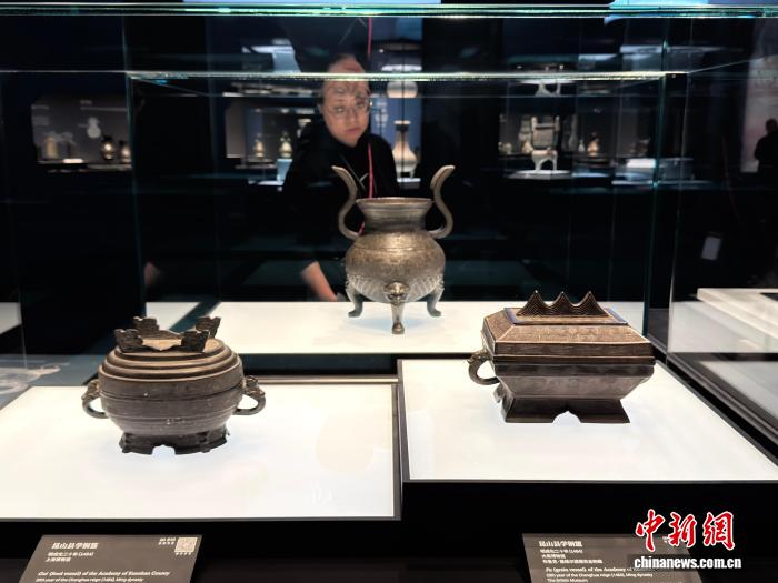 11月11日,“融古爍新:宋元明清銅器的復(fù)古與創(chuàng)新”特展在上海博物館東館正式開幕。 中新社記者 康玉湛 攝 本次展覽分為“崇古尊古、再塑三代”“鑄古維新、自成一格”“永宣垂范、震古耀今”“起居修道、古銅新意”四個(gè)單元,共展出170余件(組)展品,匯集上海博物館、大都會(huì)藝術(shù)博物館兩館珍藏,以及亞、歐、美三大洲多家博物館的重要藏品,是近年來海內(nèi)外最具規(guī)模的宋、元、明、清銅器展。 記者在展廳看到來自上海博物館、遼寧省博物館的多件北宋崇寧四年銅大晟鐘。據(jù)介紹,大晟鐘是宋徽宗時(shí)期為創(chuàng)制新樂而詔令鑄造的禮樂標(biāo)準(zhǔn)器,式樣參照春秋時(shí)期的宋公成鐘,現(xiàn)今流傳于世的有二十余件。