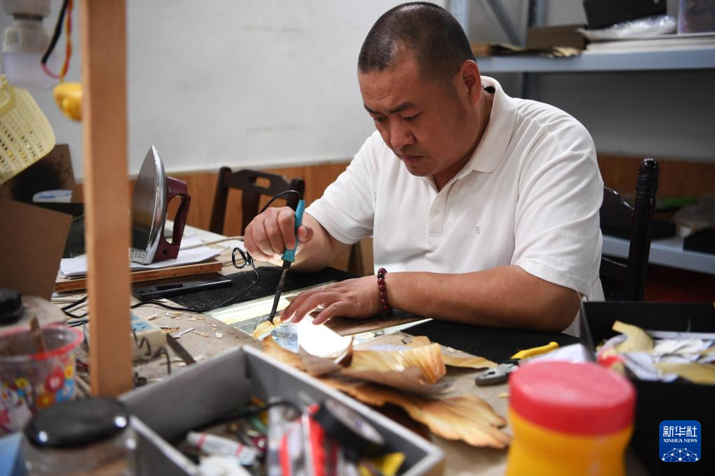 5月16日,葛磊在非遺傳習(xí)基地制作蘆葦畫。