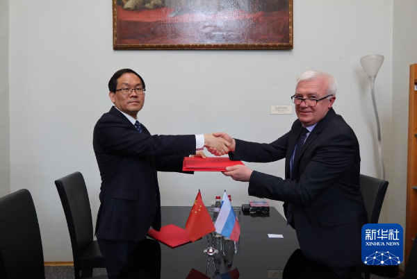 6月7日,在俄羅斯首都莫斯科,上海市歷史博物館館長(zhǎng)周群華(左)與俄羅斯國(guó)家歷史博物館館長(zhǎng)列維金簽訂友好合作備忘錄。新華社發(fā)