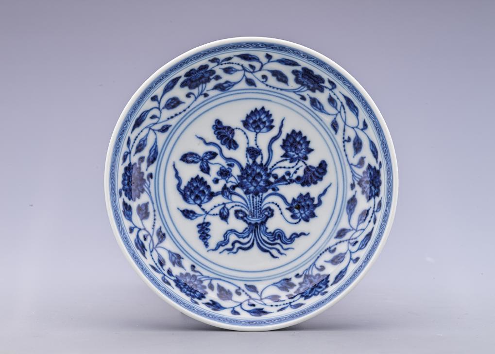 展出的清雍正青花折枝蓮紋盤。