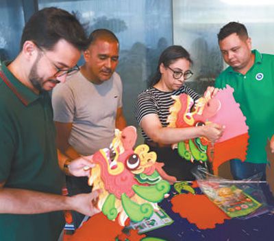 2月3日,巴西民眾在累西腓春節(jié)廟會活動現(xiàn)場體驗制作手工龍頭。本報記者 陳海琪攝
