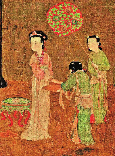 宋代女性服飾重神韻。宋代女性清秀也好,婉約也罷,臉部神態(tài)往往離不開(kāi)妝容。于眉目之間,便有“都緣自有離恨,故畫(huà)作遠(yuǎn)山長(zhǎng)”“倒暈工夫,畫(huà)得宮眉巧”;于臉頰之間,便有“嫩臉修蛾,淡勻輕掃”“淺拂胭脂輕傅粉”之淡妝,亦有“近來(lái)因甚要濃妝,不管滿城桃杏妒”之濃妝;而于神情之間,便有“和羞走,倚門(mén)回首,卻把青梅嗅”“畫(huà)愁眉,遮語(yǔ)回輕扇,含羞下繡幃”。從妝容到神態(tài),刻畫(huà)了宋代女性神韻一隅。(徐雅琴)