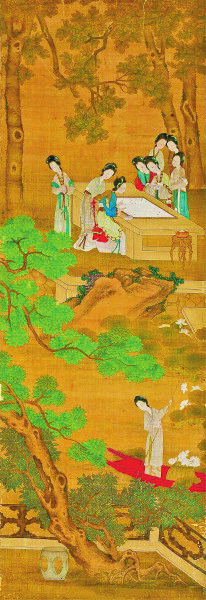 宋代畫(huà)作亦呈現(xiàn)女性服飾之濃郁色韻。畫(huà)作《女孝經(jīng)》中的女性穿著,有淡綠衫配淡紫裙、白衫配淡綠壓花裙、淡藍(lán)衫配淡黃裙等,披帛外搭相應(yīng)為淡藍(lán)、淡紫和淡黃,女性服色呈現(xiàn)出素淡搭配之主流?!冬幣_(tái)步月圖》為宋代畫(huà)家劉宗古創(chuàng)作,畫(huà)中女子裙子均為白色,衣著素淡簡(jiǎn)樸,氣質(zhì)高雅脫俗?!额率钟^花圖》中服色搭配更為柔和,女主人上穿淡紫窄袖長(zhǎng)襦,下穿白色長(zhǎng)裙,外搭淡黃披帛;侍女穿淡綠袍衫搭淡黃腰間寬巾,亦有穿淡藍(lán)袍衫搭白色腰圍?!肚迕魃虾訄D》為中國(guó)古代著名繪畫(huà),由畫(huà)家張擇端創(chuàng)作,畫(huà)中少有女性,普通勞動(dòng)?jì)D女多穿青色裙或腰系青花圍巾,有身份的女子戴蓋頭、穿紫色褙子,展現(xiàn)出簡(jiǎn)約、素雅的宋代服飾風(fēng)格。