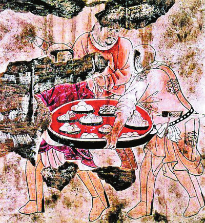 如今的主食豐富多樣,不僅包括面條、餃子、餛飩、米粉等面制品,還有以玉米、小米等雜糧為代表的粗糧制品。其實,宋代已形成中國人主食的雛形,《東京夢華錄》載:“凡餅店,有油餅店,有胡餅店。若油餅店,即賣蒸餅、糖餅、裝合、引盤之類。胡餅店即賣門油、菊花、寬焦、側厚、油碢、髓餅、新樣滿麻。每案用三五人捍劑卓花入爐?!薄罢麸灐奔创讹?,“裝合”即盒裝的餅,“引盤”是盛于盤中的食品,“捍劑卓花”意思是把面團先分成大小相近的劑子,再分別搟開成餅,最后捏出花樣。