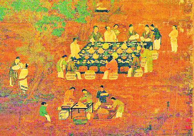 宋代面食既有團子狀、面疙瘩狀的,也有薄片狀、條狀的,前者可以用湯匙吃,后者多用筷子吃。此外,《東京夢華錄》中還詳細介紹了宋代餐廳的外觀、菜肴及客人點菜方法:“每店各有廳院東西廊,稱呼坐次??妥?,則一人執(zhí)箸紙,遍問坐客?!贝笠馐钦f,每家店都有廳堂、庭院、東西廊,待客人落座,店家便送上筷子、紙花,詢問客人要吃些什么。