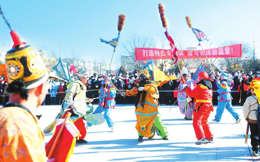 宏道鎮(zhèn)社火表演 張晉蘭攝 (二) 宏道鎮(zhèn),地靈人杰,英才輩出。作為遠(yuǎn)近聞名的文化大鎮(zhèn),早在新石器時(shí)代,這里就已經(jīng)有人類(lèi)繁衍生息,1977年發(fā)現(xiàn)的西社村新石器遺址便是明證。遺址在西社村東,地形凸起,西、北、東三面臨溝,南依古河道,面積0.27平方公里。經(jīng)山西省考古研究所和吉林大學(xué)有關(guān)專(zhuān)家鑒定,屬龍山文化遺址。1981年,該遺址被縣人民政府列為重點(diǎn)文物保護(hù)單位;1985年,又被山西省人民政府列為重點(diǎn)文物保護(hù)單位。 北社東的洪福寺,是定襄縣境內(nèi)保存最為完好的寺廟。它的建筑體現(xiàn)了宋代建筑風(fēng)格,其大殿神塑是我國(guó)宋代雕塑的精品。2001年6月25日,國(guó)務(wù)院公布第五批國(guó)家重點(diǎn)文物保護(hù)單位,洪福寺名列其中。該寺位于五臺(tái)山余脈和太行山系系舟山的夾角處,背靠龍山、鳳山,面臨同河,視野開(kāi)闊,實(shí)屬山水薈萃之地。寺坐北向南,筑于7米高的土臺(tái)之上,四周筑高堡圍墻。大殿內(nèi)供奉著華嚴(yán)三圣像,即釋迦牟尼佛、普賢菩薩、文殊菩薩,兩尊阿南迦葉脅侍菩薩和護(hù)法金剛分列左右。這些塑像造型生動(dòng),衣紋流暢,體現(xiàn)了典型的宋代塑像特點(diǎn)。大殿旁配房?jī)?nèi)有兩尊宋代彩繪侍女像,歷經(jīng)千年,依然色彩艷麗。一個(gè)偶然的機(jī)會(huì),人們發(fā)現(xiàn)侍女像下藏有金代經(jīng)卷,經(jīng)有關(guān)部門(mén)鑒定,為國(guó)家一級(jí)文物。一方水土養(yǎng)一方人。近年來(lái),青年雕刻家劉曉辰在繼承宏道木雕傳統(tǒng)技藝的基礎(chǔ)上,辦起了晟龍木雕廠(chǎng)。木雕產(chǎn)品精美絕倫,令觀(guān)者贊不絕口,多次榮獲國(guó)內(nèi)外旅游紀(jì)念品展覽和民間工藝品博覽會(huì)大獎(jiǎng)。2005 年,他又被團(tuán)中央授予“全國(guó)鄉(xiāng)村文化名人”稱(chēng)號(hào)。 該鎮(zhèn)的戲劇頭盔制作同樣歷史悠久,聞名全省。早在清光緒年間,北社西村的梁河海在蘇州學(xué)到戲劇頭盔制作手藝后,便在宏道鎮(zhèn)開(kāi)設(shè)了頭盔制作店,此后代代相傳,所制頭盔造型規(guī)范,做工精細(xì),一直是戲劇名家首選的演出用品。該鎮(zhèn)的石雕同樣享有盛譽(yù)。五臺(tái)山龍泉寺的漢白玉石牌坊舉世聞名,而它的設(shè)計(jì)者就是宏道鎮(zhèn)賈莊的石匠胡明珠。這個(gè)石牌坊高9米,寬14米,堪稱(chēng)我國(guó)近代以來(lái)石雕奇跡,是舉世罕見(jiàn)的藝術(shù)珍品。