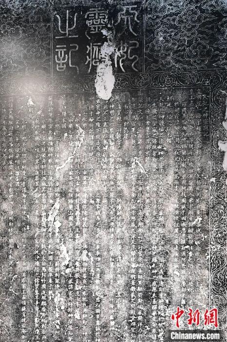 《天妃靈應之記》碑高162厘米、寬78厘米、厚16厘米。碑以黑色頁巖為料,碑額正中篆書“天妃靈應之記”,周邊飾以祥云捧月(日)圖案,兩旁陰刻如意云水紋,碑體邊框飾一周纏枝花卉紋。碑文楷書直下計31行,全文1177字,除其中有若干字磨損外,碑文清晰,至今基本完整可讀。