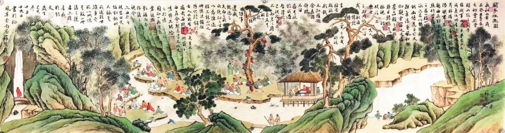東晉永和九年(353年)上巳節(jié),會稽內(nèi)史王羲之和謝安、孫綽等人在山陰蘭亭修禊,曲水流觴,飲酒賦詩,所作詩歌后來結(jié)集為《蘭亭集》,王羲之為之撰序,即被稱作“天下第一行書”的《蘭亭序》,而蘭亭雅集的詩酒風(fēng)流也成為千古佳話。在后世仿效的各類蘭亭雅集中,詩歌、繪畫、書法等多種藝術(shù)元素爭奇斗艷,形成華麗精致、傳承千載的文化景觀。