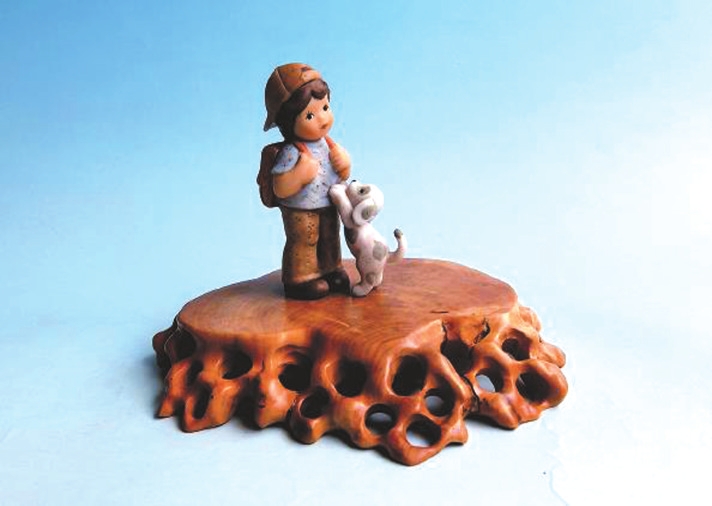 我的藏品中有一件來自德國的喜姆瓷偶·上學(xué),它是赴德工作的同事帶回的禮物。這件瓷偶高8.5厘米、長5.5厘米、寬2.8厘米,生動(dòng)刻畫了一個(gè)背著雙肩包即將去學(xué)校的小男孩和一只不舍小主人離開的花狗,溫馨逗趣的畫面讓人忍俊不禁。