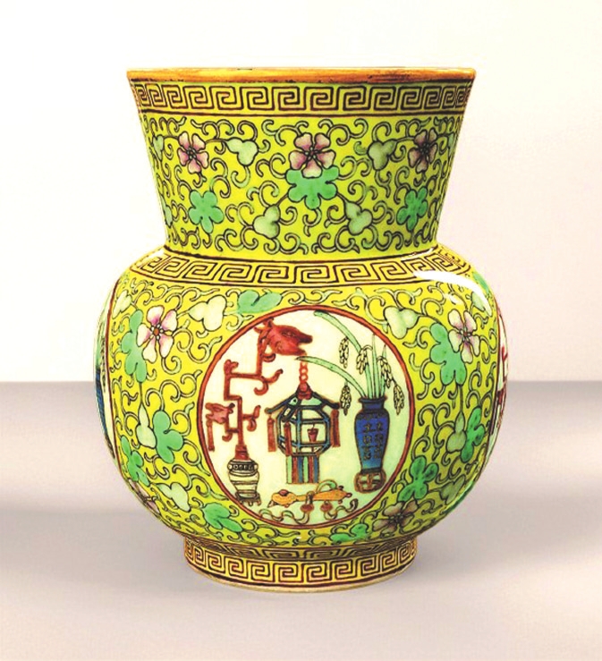 故宮博物院收藏的清代粉彩葫蘆萬(wàn)代五谷豐登紋渣斗,內(nèi)壁繪粉彩纏枝葫蘆紋,藤蔓相連,花果繁茂,寓意“子孫綿延”“多子多?!保煌獗邳S地亦繪相同葫蘆紋,設(shè)四處圓形開(kāi)光,內(nèi)有宮燈、花瓶、如意、稻穗等,寓意“平安如意”“五谷豐登”。開(kāi)光內(nèi)花瓶飾“囍”字,表明為皇帝大婚用瓷,既祈子嗣繁衍,又添喜慶吉祥。整器色彩明艷,紋飾繁密華麗,盡顯清代晚期宮廷裝飾的典型風(fēng)格。