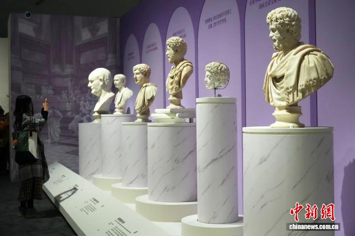 11月10日,“羅馬 羅馬:從奧林匹斯到卡皮托利”古羅馬藝術(shù)大展在上海世博會博物館開幕。圖為狩獵女神阿爾忒彌斯(狄安娜)雕像。 中新社記者 張亨偉 攝 展廳里,宙斯(朱庇特)雕像、波塞冬(尼普頓)頭像等近20件大型神像,揭示出古羅馬人對古希臘神話的“創(chuàng)造性轉(zhuǎn)化”。其中一件狩獵女神阿爾忒彌斯(狄安娜)雕像,文物保護(hù)員已鑒定出127件不同的大理石碎片,反映出制作者的高超技藝。 羅馬帝國首位皇帝——奧古斯都(原名“蓋烏斯·屋大維”),第一位留胡子的羅馬皇帝——哈德良,著有《沉思錄》的羅馬“五賢帝”之一——馬可·奧勒留……26件羅馬皇帝貴族半身像的集中亮相,則勾勒出古羅馬從城邦崛起為帝國的歷史過程。