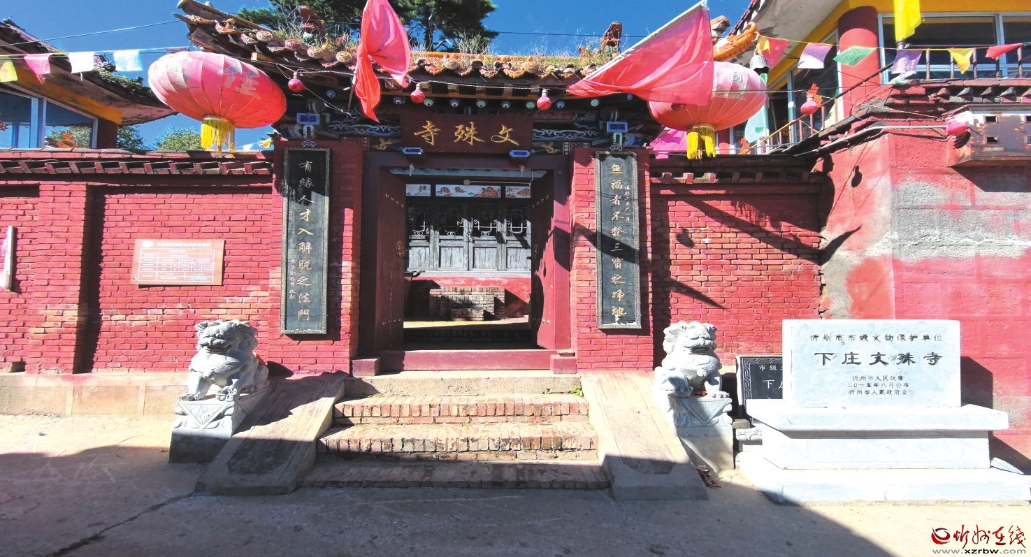下莊文殊寺位于五臺(tái)縣東雷鄉(xiāng)下莊村中,始創(chuàng)年代不詳,現(xiàn)存建筑為明代所建。寺廟坐北向南,占地面積368平方米。山門一間,中置板門。正殿面寬三間、進(jìn)深五椽,前出廊(此走廊屬清代遺構(gòu),為后期加接),廊柱施斗拱,大斗口內(nèi)出跳,兩側(cè)帶有雕花翼拱。檐柱頭斗拱為五踩,其下昂已被鋸掉(現(xiàn)存昂嘴為清代更換的如意昂式);平身科斗拱亦為五踩。當(dāng)心間設(shè)門,兩次間設(shè)直欞窗。