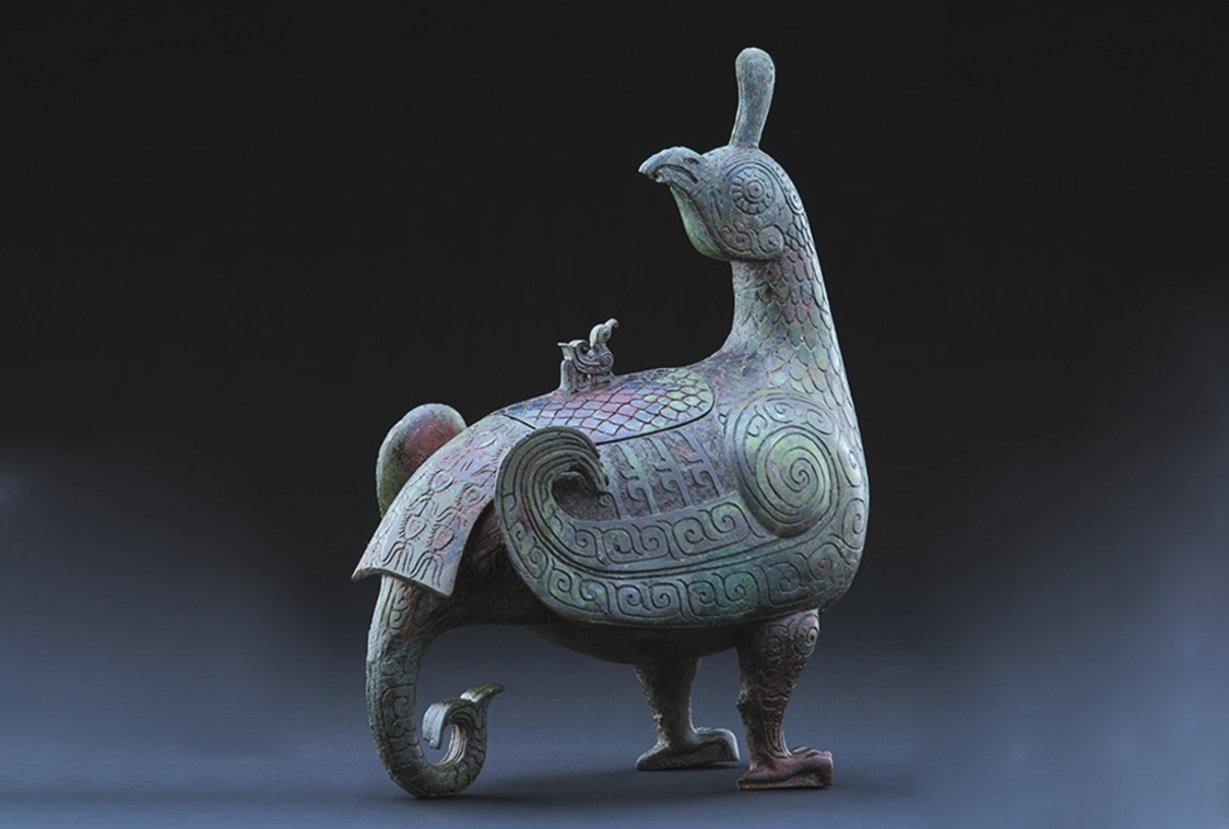 山西,東倚巍峨太行,西臨滔滔黃河,表里山河。作為中華民族的重要發(fā)祥地之一,這里地上地下的古代遺珍燦若星辰。晉侯鳥尊,高39厘米,長(zhǎng)30.5厘米,寬17.5厘米。整個(gè)器物以佇立回首的鳳鳥為主體造型,鳥頭微昂,圓睛凝視,高冠直立,體軀豐滿,兩翼上卷。鳥背依形設(shè)蓋,蓋鈕為小鳥形,與鳳鳥對(duì)望,雙腿粗壯,爪尖略蜷。全身布滿了精美紋飾,頸、腹、背裝飾羽片紋,兩翼與雙腿裝飾云紋,翼、蓋間裝飾立羽紋,以雷紋襯底,尾部裝飾華麗的羽翎紋。