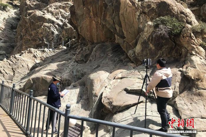賀蘭山巖畫區(qū)域測(cè)繪與本體數(shù)字化留存項(xiàng)目開展期間,工作人員在賀蘭山巖畫遺址進(jìn)行數(shù)據(jù)采集工作。(資料圖)銀川市賀蘭山巖畫管理處供圖