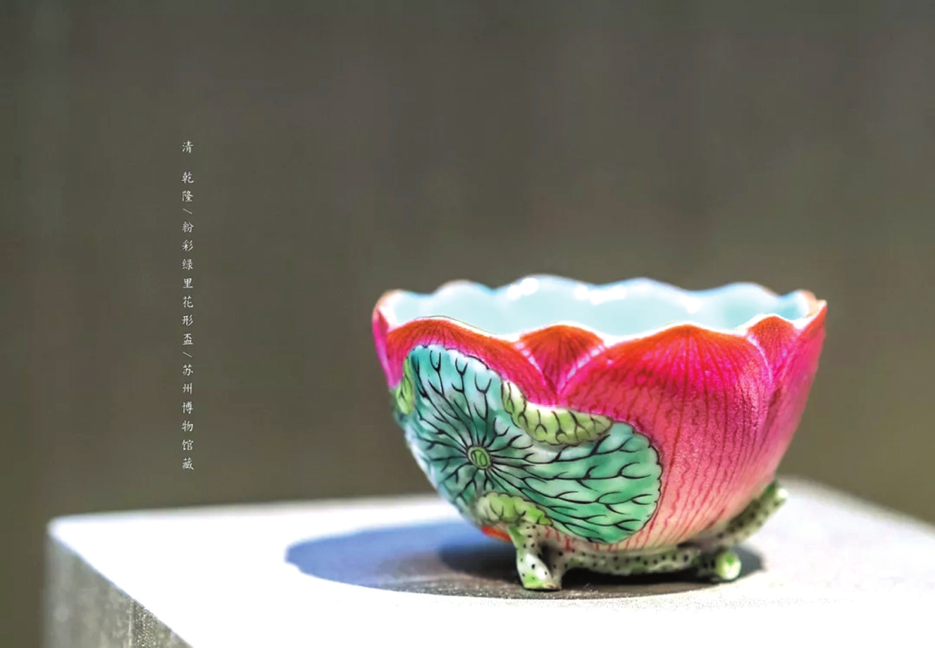 相比之下,仿生瓷則源于對自然的崇尚,以豐富的造型模擬自然物象,取材生動,花草蔬果、鳥獸蟲魚,以至木石紋理皆可入瓷。它們或潑辣清新,或簡練樸素,既展現(xiàn)了工匠高超的塑形技藝,更傳遞著“天人合一”的造物思想以及追求野趣、崇尚自由、返璞歸真的人生境界。如元龍泉窯荷葉蓋罐、萬歷青花梵文蓮瓣盤、乾隆粉彩綠里花形杯、道光木紋釉花盆等,都是平時難得一見的館藏仿生瓷器。(許鑫城)