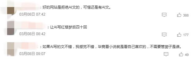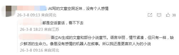 有報(bào)道稱,社交媒體上的AI寫作暴富噱頭,讓網(wǎng)文圈變了天。有網(wǎng)文作家坦言,自己日更近萬字已是極限,但在AI幾分鐘幾萬字面前,直接被降維打擊。評論區(qū)里,網(wǎng)友議論紛紛,“AI寫的文章空洞乏味,沒有個人感情”“有一本AI文火的嗎”……