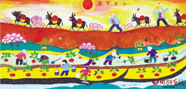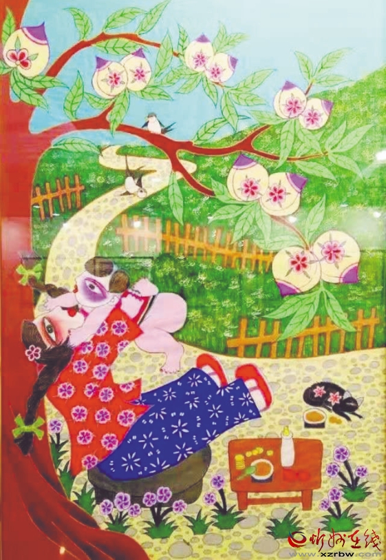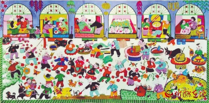 炕圍畫又稱“墻圍畫”,是一種中國民間常見的室內(nèi)裝飾畫。忻州處于高寒地帶,在農(nóng)村家家戶戶都用火炕取暖御寒,炕上的墻面極易脫落起皮,蹭臟衣物被褥。于是人們以刷墻所用的白土調(diào)以膠水,在環(huán)炕的墻上涂高約二尺的“圍子”,既保護(hù)了墻面,又使人們免遭臟衣污物之累。后來,炕圍畫逐漸發(fā)展為以顏料做底、色彩畫花、桐油涂罩,既鮮艷明亮,又堅固耐久。日常臟污了,用濕布擦拭,則又光亮如新。