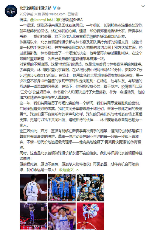 人民網(wǎng)北京9月15日電(楊喬棟)15日,林書豪通過個(gè)人社交平臺(tái)發(fā)布自制視頻宣布,下個(gè)賽季將不再代表北京首鋼男籃征戰(zhàn)CBA賽場(chǎng),而將繼續(xù)尋求征戰(zhàn)美國(guó)職業(yè)籃球聯(lián)賽的機(jī)會(huì)。林書豪在視頻中稱,最近四周都在思考下一步的規(guī)劃,但是最終還是忍痛做了一個(gè)艱難的決定——暫時(shí)告別CBA,“我決定今年(下個(gè)賽季)不回首鋼去打球,這個(gè)決定是我人生最難的一個(gè)決定。”隨后,北京首鋼男籃通過官方微博發(fā)布長(zhǎng)文,在確認(rèn)林書豪“離開”的同時(shí)也第一時(shí)間為其送上祝福。北京男籃官宣全文如下: