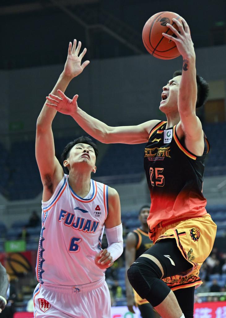 1月4日,福建隊球員黎伊揚(左)在江蘇隊球員馬建豪的防守下上籃。新華社發(fā)(王須中攝)