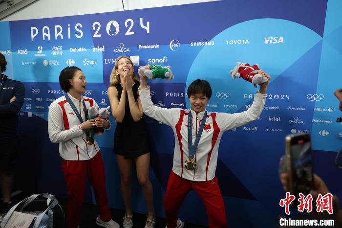 當(dāng)?shù)貢r(shí)間7月31日,在巴黎奧運(yùn)會(huì)跳水女子雙人10米臺(tái)項(xiàng)目中,中國(guó)隊(duì)組合陳芋汐/全紅嬋獲得冠軍。谷愛凌(中)在賽后化身粉絲與陳芋汐(左)、全紅嬋合影。 中新社記者 富田 攝