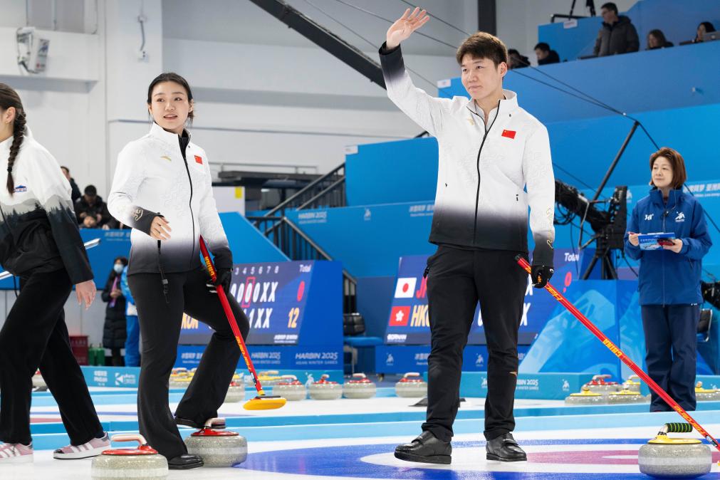 2月5日,中國(guó)隊(duì)選手王智宇(前右)/韓雨在賽后向觀眾致意。當(dāng)日,在哈爾濱舉行的2025年第九屆亞冬會(huì)冰壺混雙循環(huán)賽B組第三輪比賽中,中國(guó)隊(duì)8:3戰(zhàn)勝吉爾吉斯斯坦隊(duì)。新華社記者 謝劍飛 攝