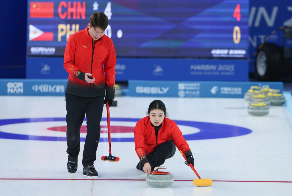 2月5日,中國(guó)隊(duì)選手王智宇/韓雨(右)在比賽中。當(dāng)日,在哈爾濱舉行的第九屆亞冬會(huì)冰壺混雙循環(huán)賽B組第五輪比賽中,中國(guó)隊(duì)9:6戰(zhàn)勝菲律賓隊(duì)。新華社記者 王楷焱 攝