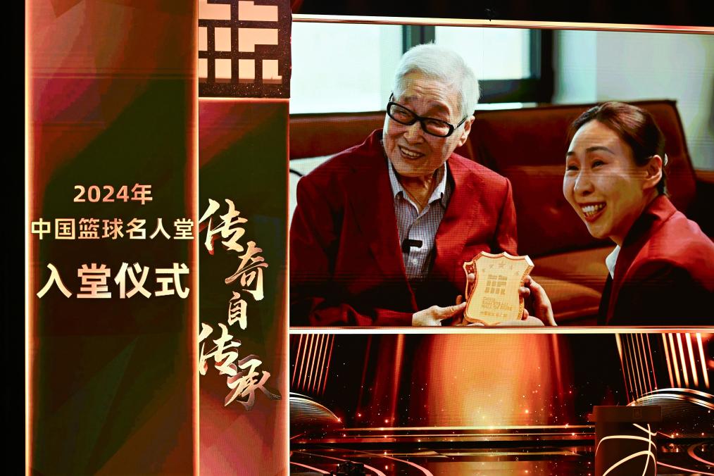 3月23日,入堂儀式上播放中國籃球名人堂入堂人物“杰出女運動員”楊潔(左)領取徽章的視頻。新華社記者 陳鐘昊 攝