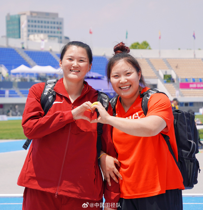 中國(guó)隊(duì)選手吉莉(右)和李江燕(左)分獲女子鏈球項(xiàng)目金、銀牌。圖源:中國(guó)田徑隊(duì)微博