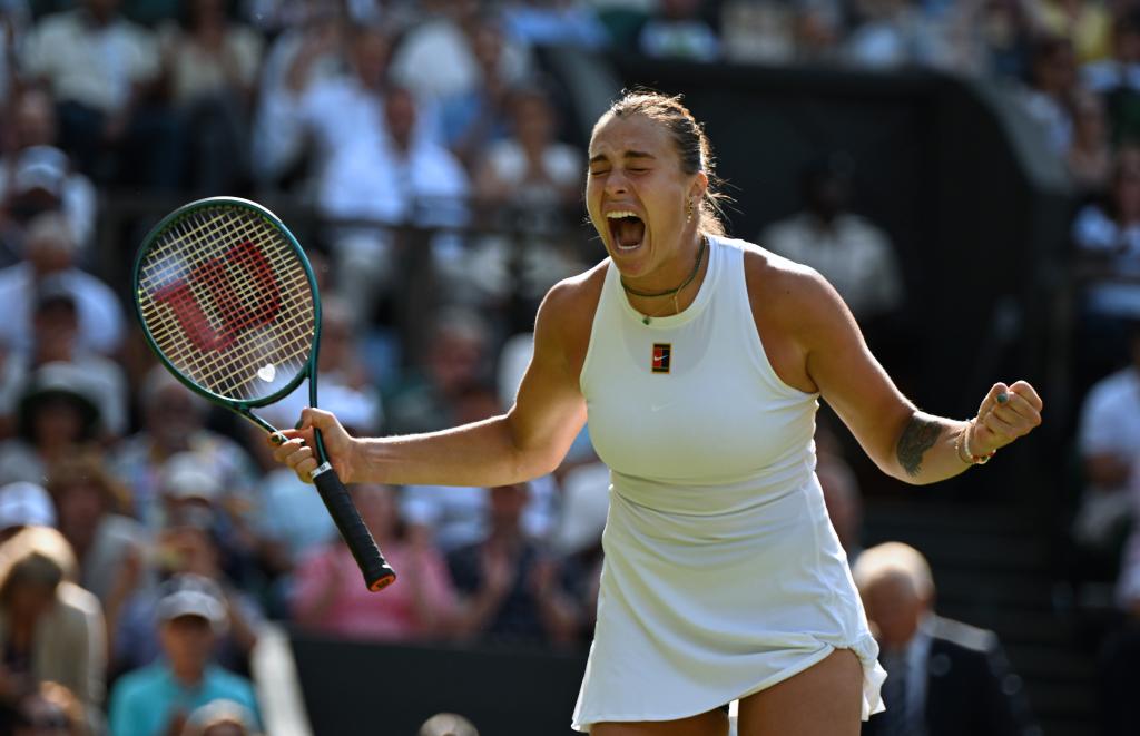 7月8日,薩巴倫卡在比賽后慶祝勝利。新華社記者 李穎 攝