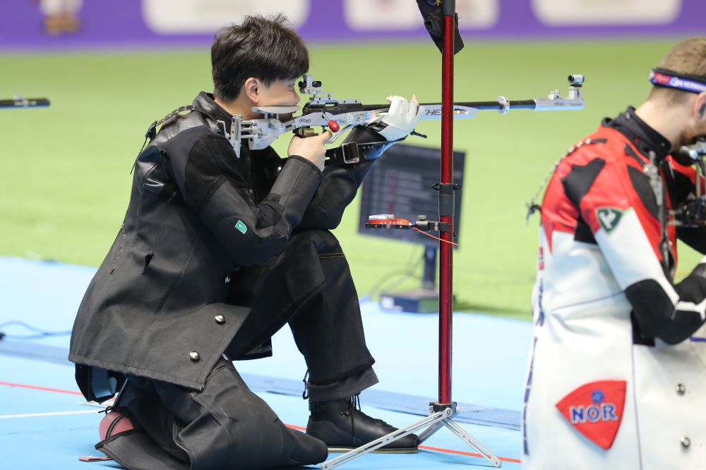 男子50米步槍三姿決賽的懸念持續(xù)到最后一槍。跪射和臥射結(jié)束后,奧運冠軍劉宇坤比排名第二的印度新秀托馬爾高出0.2環(huán)。此后,這位28歲的世界紀(jì)錄保持者始終保持著微弱領(lǐng)先。倒數(shù)第二槍,劉宇坤打出9.7環(huán),被托馬爾反超0.1環(huán)。最后一槍,劉宇坤10.1環(huán),而對手經(jīng)過長時間猶豫打出9.8環(huán),葬送良機。劉宇坤以0.2環(huán)的優(yōu)勢驚險奪冠,成績?yōu)?67.1環(huán)。這也是劉宇坤的第一個世錦賽冠軍,他曾在2017年世錦賽中獲得該項目青年組冠軍。