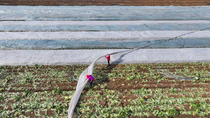 △2025年12月11日,山東東營(yíng)廣饒縣,農(nóng)民為作物覆蓋防寒無(wú)紡布。