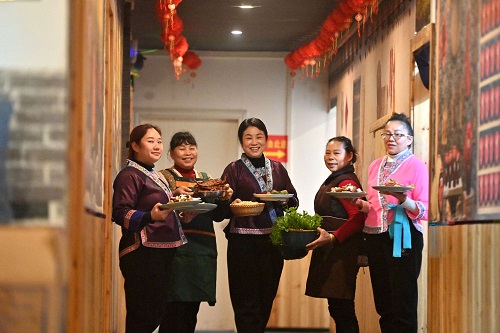 2025年2月28日,在廣西柳州市融水苗族自治縣融水鎮(zhèn)一家餐館,負(fù)責(zé)人吳葵花(中)和員工展示菜品。吳葵花經(jīng)營餐館22年,長期為當(dāng)?shù)剞r(nóng)村群眾提供穩(wěn)定就業(yè)崗位,并收購偏遠(yuǎn)山區(qū)群眾種植的蔬菜。在廣西大山里,一批女能人活躍在農(nóng)村電商、民宿餐飲、鄉(xiāng)村文旅等各個領(lǐng)域,帶動留守婦女發(fā)展產(chǎn)業(yè),實現(xiàn)就近居家就業(yè)創(chuàng)業(yè)。新華社記者 黃孝邦 攝