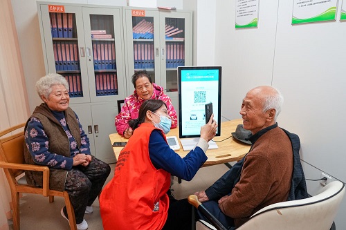 2025年10月23日,老人在山東省淄博市張店區(qū)馬尚街道金石社區(qū)日間護理中心測量健康數(shù)據(jù)。新華社記者 朱崢 攝