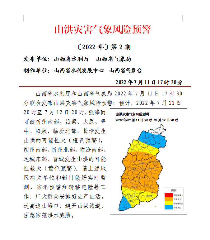 山西省水利廳和山西省氣象局2022年7月11日17時(shí)30分聯(lián)合發(fā)布山洪災(zāi)害氣象風(fēng)險(xiǎn)預(yù)警:預(yù)計(jì),2022年7月11日20時(shí)至7月12日20時(shí),強(qiáng)降雨可致忻州南部、呂梁、太原、晉中、陽(yáng)泉、臨汾北部、長(zhǎng)治發(fā)生山洪的可能性大(橙色預(yù)警),朔州南部、忻州北部、臨汾南部、運(yùn)城東部、晉城發(fā)生山洪的可能性較大(黃色預(yù)警)。