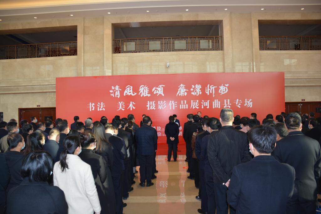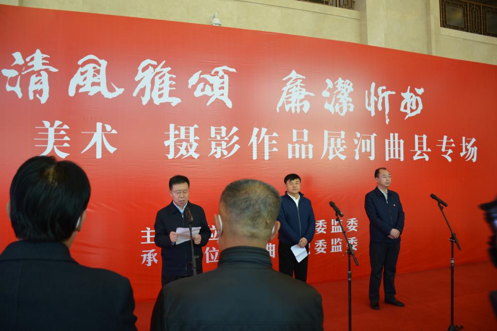 翰墨丹青揚正氣,清風廉韻沁民心。11月10日,由忻州市紀委監(jiān)委主辦,河曲縣紀委監(jiān)委承辦的“清風雅頌·廉潔忻州”書畫美術(shù)攝影展河曲縣專場,在臨隩公園美術(shù)館開展。市政協(xié)副主席、縣委書記邊東圣出席儀式并作重要講話,縣委副書記、縣長任鴻賓宣布“清風雅頌·廉潔忻州”書法美術(shù)攝影展開展,縣委常委、縣紀委書記、縣監(jiān)委主任張永明主持開展儀式。縣四大班子領(lǐng)導(dǎo)和其他縣處級領(lǐng)導(dǎo),全縣各鄉(xiāng)鎮(zhèn)、居民辦、黨群、政府、發(fā)改、農(nóng)口、政法、宣傳文衛(wèi)各口黨員干部及全體紀檢監(jiān)察干部共計180余人參加了開展儀式。
