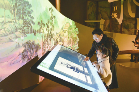 2月8日,運城市河?xùn)|歷史文化展示中心內(nèi),游客正在數(shù)字互動屏幕前駐足查看歷史資料。楊晨玉攝