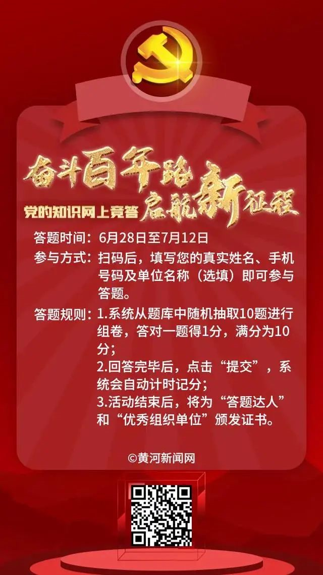 學(xué)習(xí)百年黨史,傳承紅色基因,汲取奮進(jìn)力量。為慶祝中國共產(chǎn)黨成立100周年,重溫黨的光輝歷程與偉大成就,扎實推動黨史學(xué)習(xí)教育走深走實,由山西省委網(wǎng)信辦指導(dǎo)、黃河新聞網(wǎng)承辦的【奮斗百年路 啟航新征程】黨的知識網(wǎng)上競答正式上線,邀您參與!