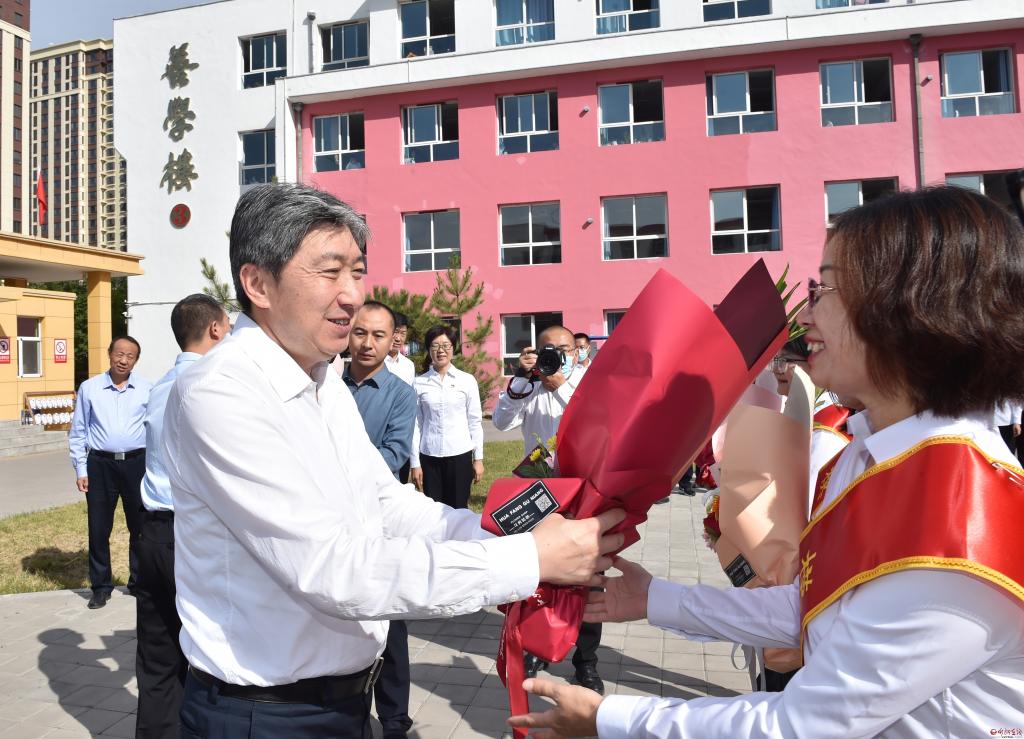 每到一處,朱曉東都與教師們深入交流,了解學(xué)校建設(shè)發(fā)展情況,關(guān)切詢(xún)問(wèn)他們的工作生活情況,感謝他們?yōu)槲沂薪逃聵I(yè)發(fā)展作出的貢獻(xiàn),并為優(yōu)秀教師代表送上了鮮花,祝他們節(jié)日快樂(lè)。朱曉東指出,新一屆省委、省政府作出構(gòu)建“一群兩區(qū)三圈”城鄉(xiāng)區(qū)域發(fā)展新格局的重大戰(zhàn)略部署,明確提出“強(qiáng)勢(shì)打造太忻一體化經(jīng)濟(jì)區(qū)北引擎,引領(lǐng)帶動(dòng)忻州與太原、雄安新區(qū)相向發(fā)展,打造我省融入京津冀和服務(wù)雄安新區(qū)的重要走廊”,賦予忻州“建設(shè)開(kāi)放發(fā)展前沿城市”的戰(zhàn)略定位,忻州發(fā)展迎來(lái)了前所未有、千載難逢的重大機(jī)遇。不論是太忻一體化經(jīng)濟(jì)區(qū)建設(shè),還是建設(shè)開(kāi)放發(fā)展前沿城市,都離不開(kāi)人才的支撐。希望廣大教育工作者身在學(xué)校、心系全局,秉持“負(fù)責(zé)任、動(dòng)腦筋、講良心”的工作要求,潛心教學(xué)鉆研、立德樹(shù)人,以更加飽滿(mǎn)的熱情投身教育事業(yè),為忻州經(jīng)濟(jì)社會(huì)發(fā)展培養(yǎng)更多的優(yōu)秀人才。