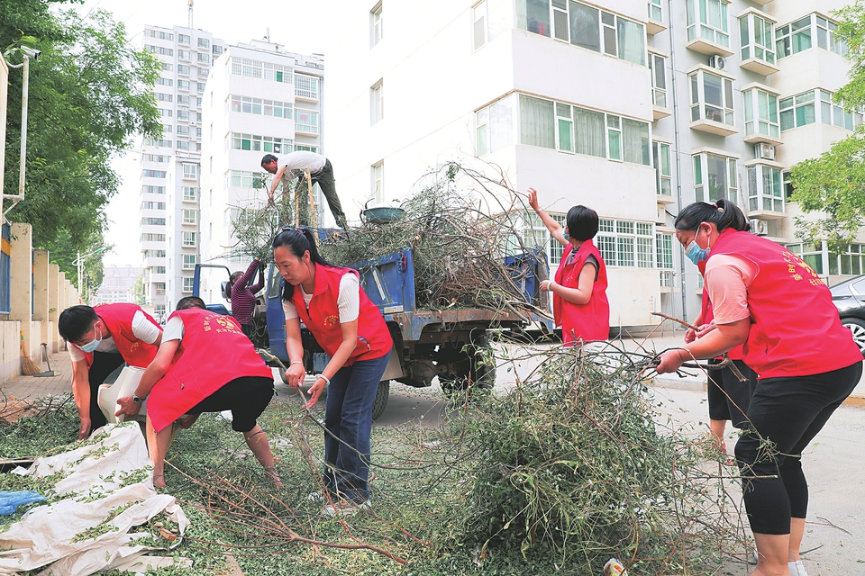 志愿者正在清理小區(qū)內垃圾。 本報記者馮毅松攝