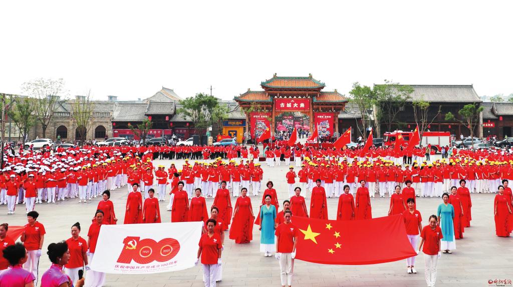 頌歌獻(xiàn)給黨,啟航新征程。在中國共產(chǎn)黨成立100周年之際,千余人歡聚忻州古城廣場,群情昂揚(yáng)、載歌載舞喜慶黨的百年華誕。 張存良攝