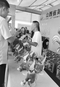 開幕式前,提前一兩個小時安檢入場的觀眾,遠遠就看到“翔翔”的召喚,紛紛在吉祥物專營區(qū)扎堆。“68元一個,就剩30個了?!睂I區(qū)的售賣者告訴山西晚報記者,他們也沒想到這只褐馬雞如此受歡迎,很快就要被搶沒了。大同的趙女士搶到一個,她說朋友從外地剛回來不方便出門,讓她買一個留作紀念。