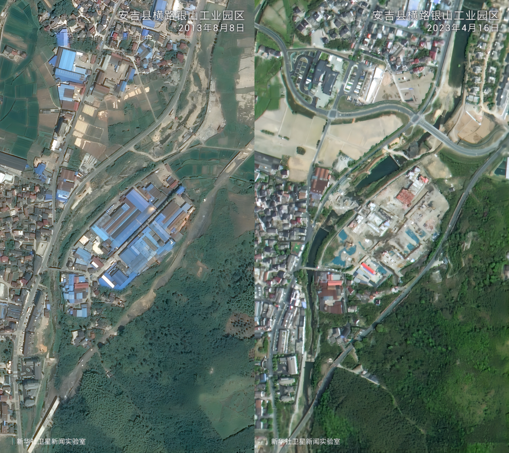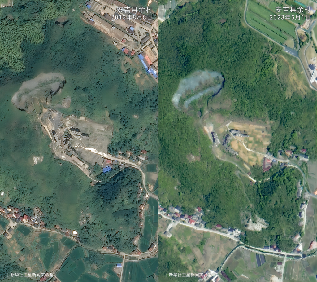 在“綠水青山就是金山銀山”理念指引下,20年來(lái)浙江省安吉縣余村完成了從水泥廠、礦山遍布到“人在余村走、就是畫(huà)中游”的精彩蝶變。衛(wèi)星云圖中的大片灰色如今已被滿目綠色所覆蓋,從“工業(yè)飛鳥(niǎo)”到“生態(tài)田園”,余村百姓看到了美景,富足了精神。