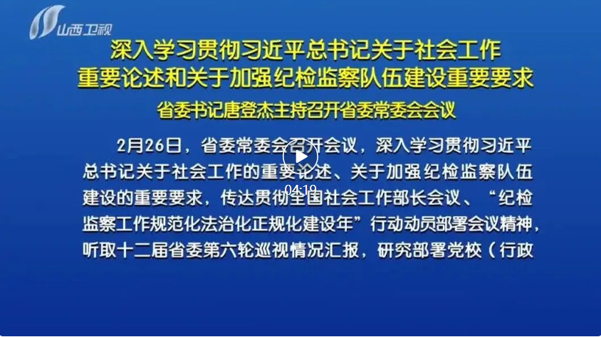 山西日報報道 2月26日,省委常委會召開會議,深入學習貫徹習近平總書記關于社會工作的重要論述、關于加強紀檢監(jiān)察隊伍建設的重要要求,傳達貫徹全國社會工作部長會議、“紀檢監(jiān)察工作規(guī)范化法治化正規(guī)化建設年”行動動員部署會議精神,聽取十二屆省委第六輪巡視情況匯報,研究部署黨校(行政學院)工作。省委書記唐登杰主持會議。