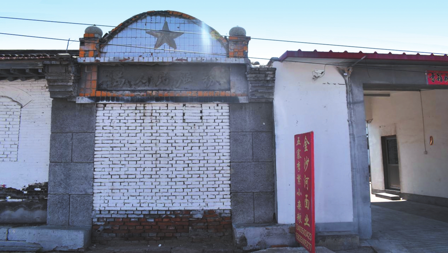 舊址分東西兩院:東院東西長70米、南北長20.3米,占地面積1421平方米,面闊18間,青筒灰瓦布瓦頂;西院南北長20.3米、東西長31.6米,占地面積641.48平方米,面闊11間,人字頂青瓦房。大門坐西朝東,正中央設(shè)券門,門額正中刻五角星,門楣上方有毛體書寫“為人民服務(wù)”字樣。