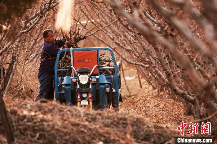 桃農(nóng)將修剪的樹枝裝車運回。高新生 攝