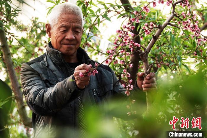 桃農(nóng)查看中油4號油桃桃花授粉情況。高新生 攝