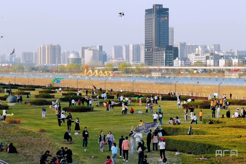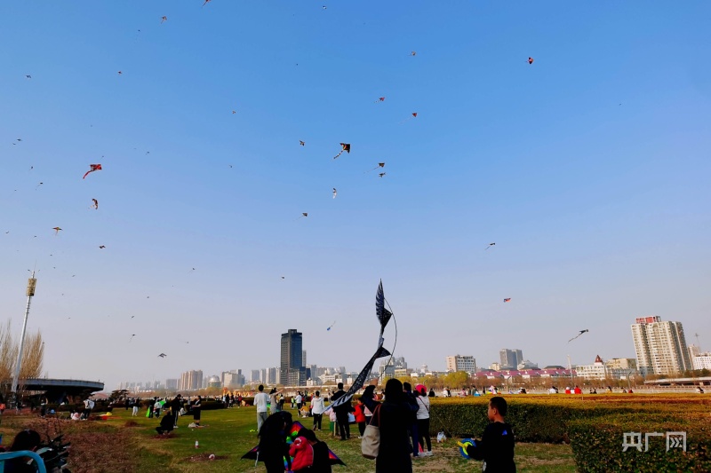 湛藍(lán)的天空中,紙鳶翩然(央廣網(wǎng)記者 郎麒 攝) 3月31日,記者在綠意盎然的汾河岸畔,看到不少市民聚集,他們或拽著風(fēng)箏線奔跑,或手持線軸調(diào)整飛行中風(fēng)箏的姿態(tài),天空中各種造型的風(fēng)箏飛舞,天上地下一片熱鬧景象。每到春天“放飛季”,汾河邊就成了風(fēng)箏愛好者的樂園,他們中有的是資深玩家,有的是初學(xué)者,大家互相交流風(fēng)箏放飛的經(jīng)驗(yàn),再順道來一場小型風(fēng)箏比賽,歡聲笑語間更覺春意盎然?!胺棚L(fēng)箏不僅能讓人親近自然,還能強(qiáng)身健體,所以每年春天我都會陪孩子放風(fēng)箏,算是我們迎接春天的固定‘節(jié)目’?!毙吓繋е?歲的兒子,一邊組裝新買的老鷹造型風(fēng)箏,一邊跟記者說。