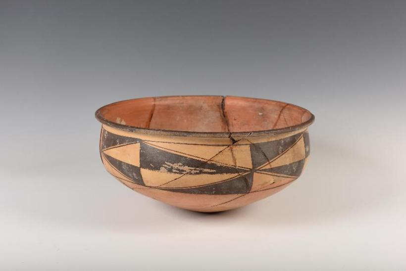 器身以棕紅色陶衣為底色,用黑色繪出三角形幾何紋,組成了有節(jié)奏、優(yōu)美流暢的裝飾。隨著視中心的轉移便會產(chǎn)生菱形格、“米”字格和回旋紋的變化。
